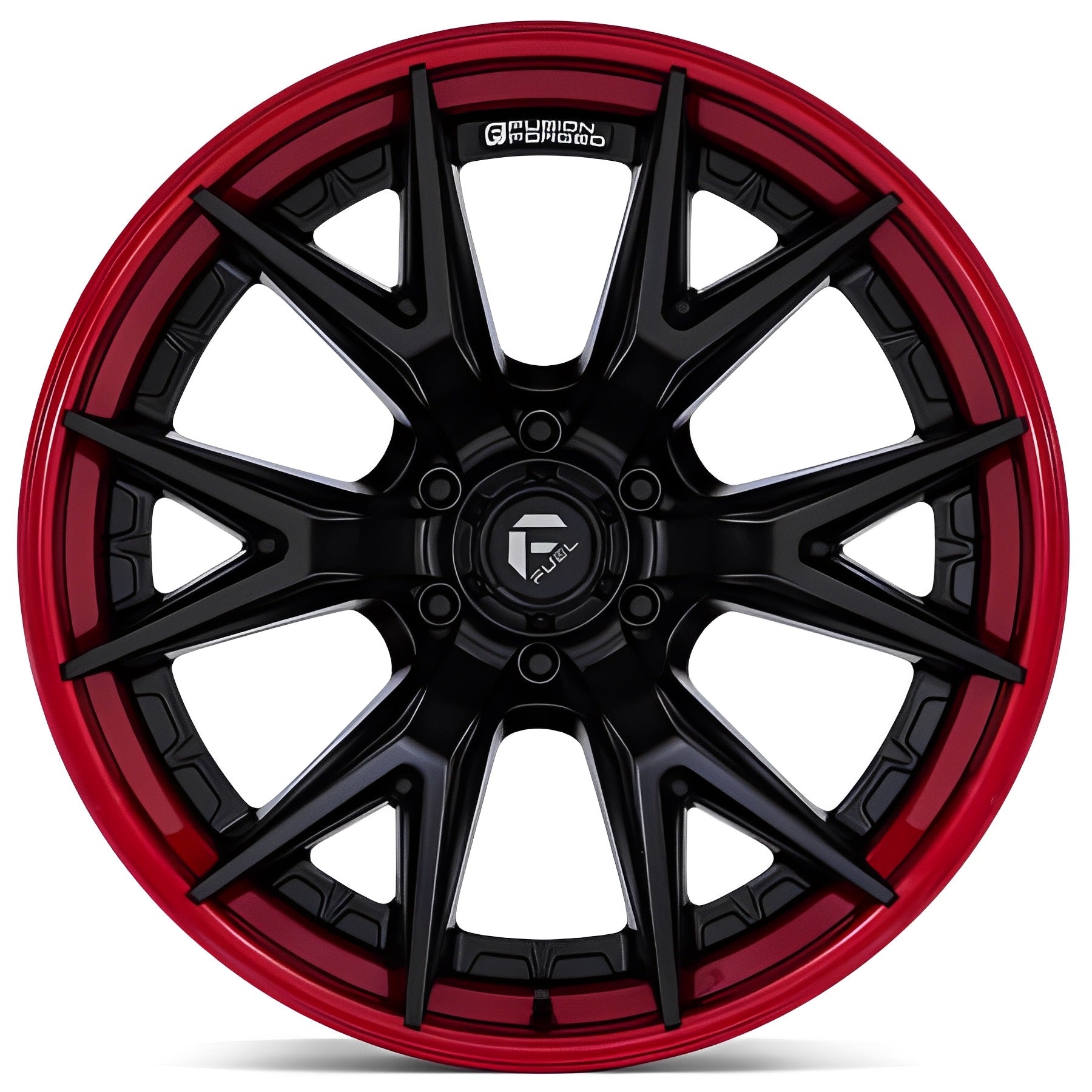 The Fuel Catalyst FC402 in a 20x10 size with a –18mm offset and 6x5.5 bolt pattern is a standout option for drivers looking to elevate the look and performance of their truck or SUV. Designed with a modern split-spoke layout and deep concave profile, this wheel projects a bold and aggressive stance, ideal for off-road builds and lifted trucks. The matte black finish paired with a vivid candy red lip creates a strong visual impact, making it one of the most eye-catching wheels in Fuel Off-Road’s one-piece lineup.