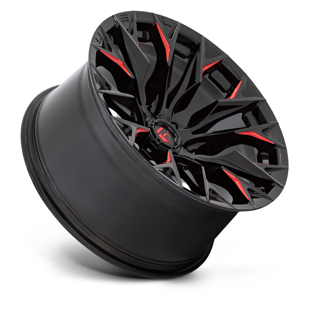 The Fuel Flame D823 20x10 –18mm is a dynamic and aggressive wheel designed for truck owners who want to make a bold statement. Finished in a striking gloss black with milled spokes accented in candy red, this wheel turns heads with its unique and modern style. The red-tinted milling adds just the right amount of flair, giving the wheel a vibrant yet refined appearance that stands out on the street or at the show.