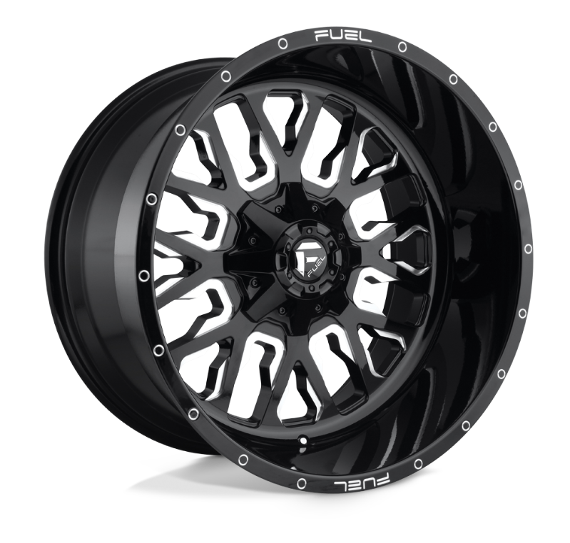 The Fuel Stroke 20x12 –43mm in Gloss Black with Milled Accents is a bold and aggressive wheel built to make a strong visual impact while delivering reliable performance. Designed with a powerful concave profile, this wheel features sharp, multi-directional spokes that stretch out to a wide lip, giving it an unmistakable off-road-ready stance. The gloss black finish provides a sleek and modern base, while the milled spoke edges add depth and precision, enhancing the wheel’s visual appeal with crisp detailing.