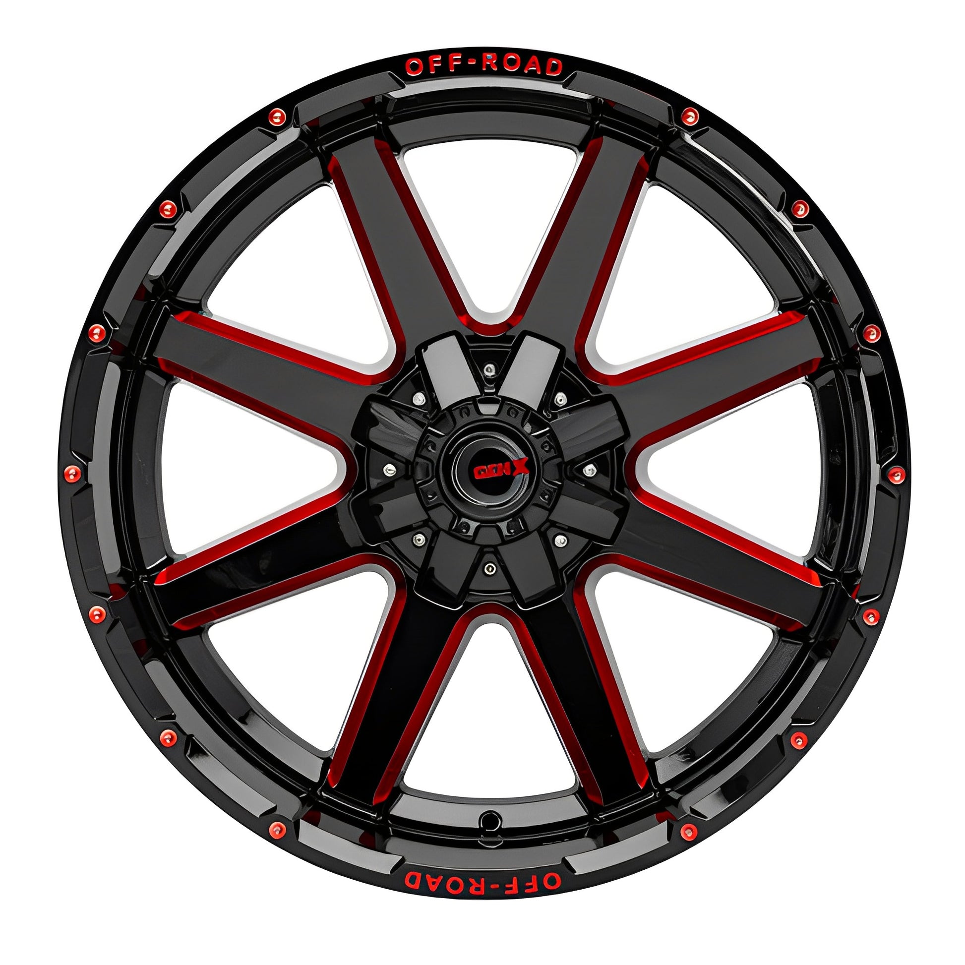 Visually, the wheel is a standout. Its Gloss Black finish provides a clean, reflective base that pairs aggressively with the Red Milled accents carved into the edges of each spoke. These milled details are not just decorative—they provide dimensional depth that gives the wheel a premium, custom-machined look straight out of the box. It’s the kind of styling that draws attention at shows and on the street, but still holds its own off-road.
