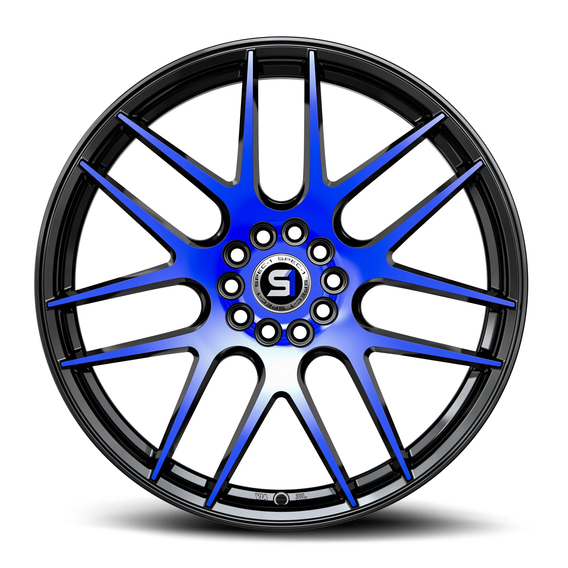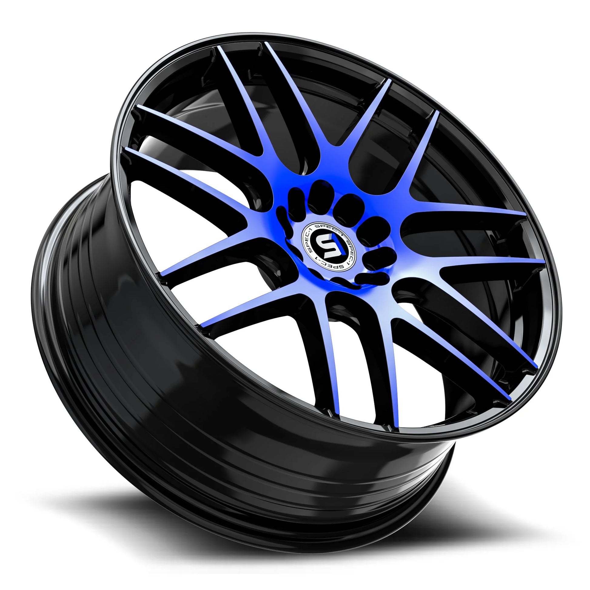 Visually, the SP-65 stands out with its concave multi-spoke design, finished in a gloss black with blue machined face. This combination gives it a bold look that complements both modern and retro-styled cars. The blue machined lip adds depth and contrast, making the wheel look even more dynamic in motion or while stationary.