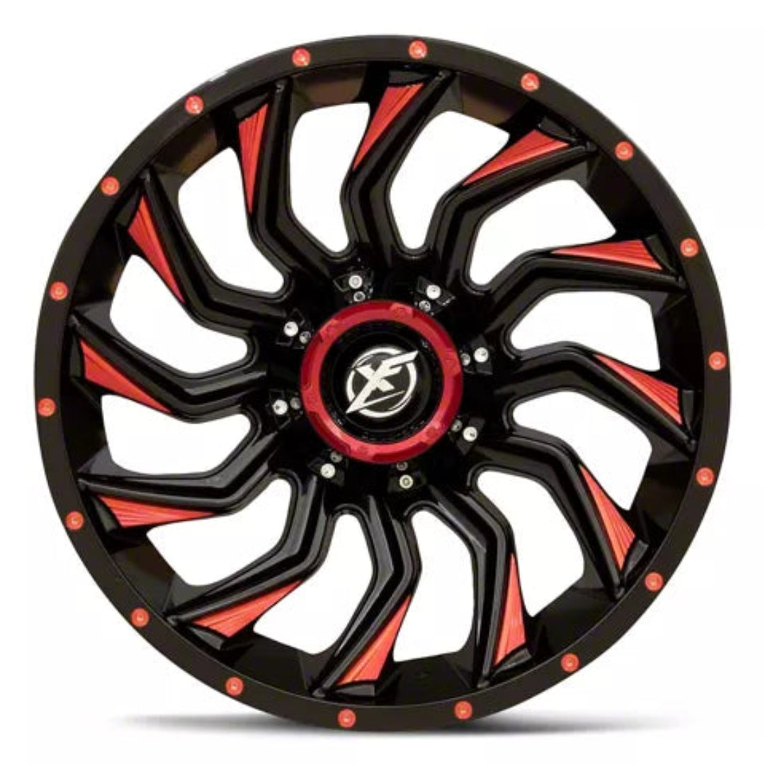 Whether you’re looking to give your Jeep a bolder trail-ready appearance or transform your pickup into a show-stopping street machine, the XF Off-Road XF-224 20x10 -12 Gloss Black Red Milled delivers the style, stance, and durability to make it happen.